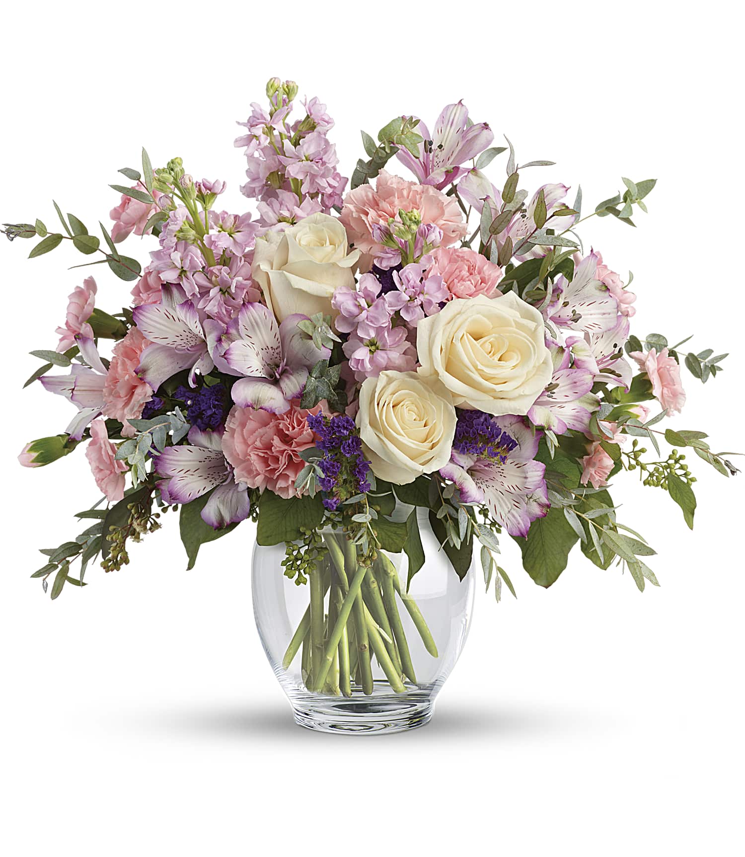 Send mom some inspiration this Mother's Day with this peaceful pastel carnation and light purple alstroemeria bouquet! The pale colors of the lavender alstroemeria and the pink carnations balance perfectly in this perfectly composed arrangement. Please note, the premium size contains creme roses.