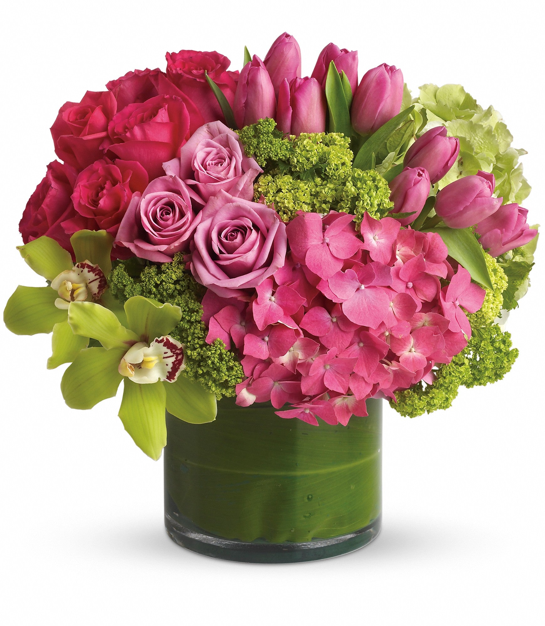 Green and pink hydrangeas, green cymbidium orchids, hot pink and lavender roses, tulips and more are beautifully arranged in a clear glass cylinder vase.