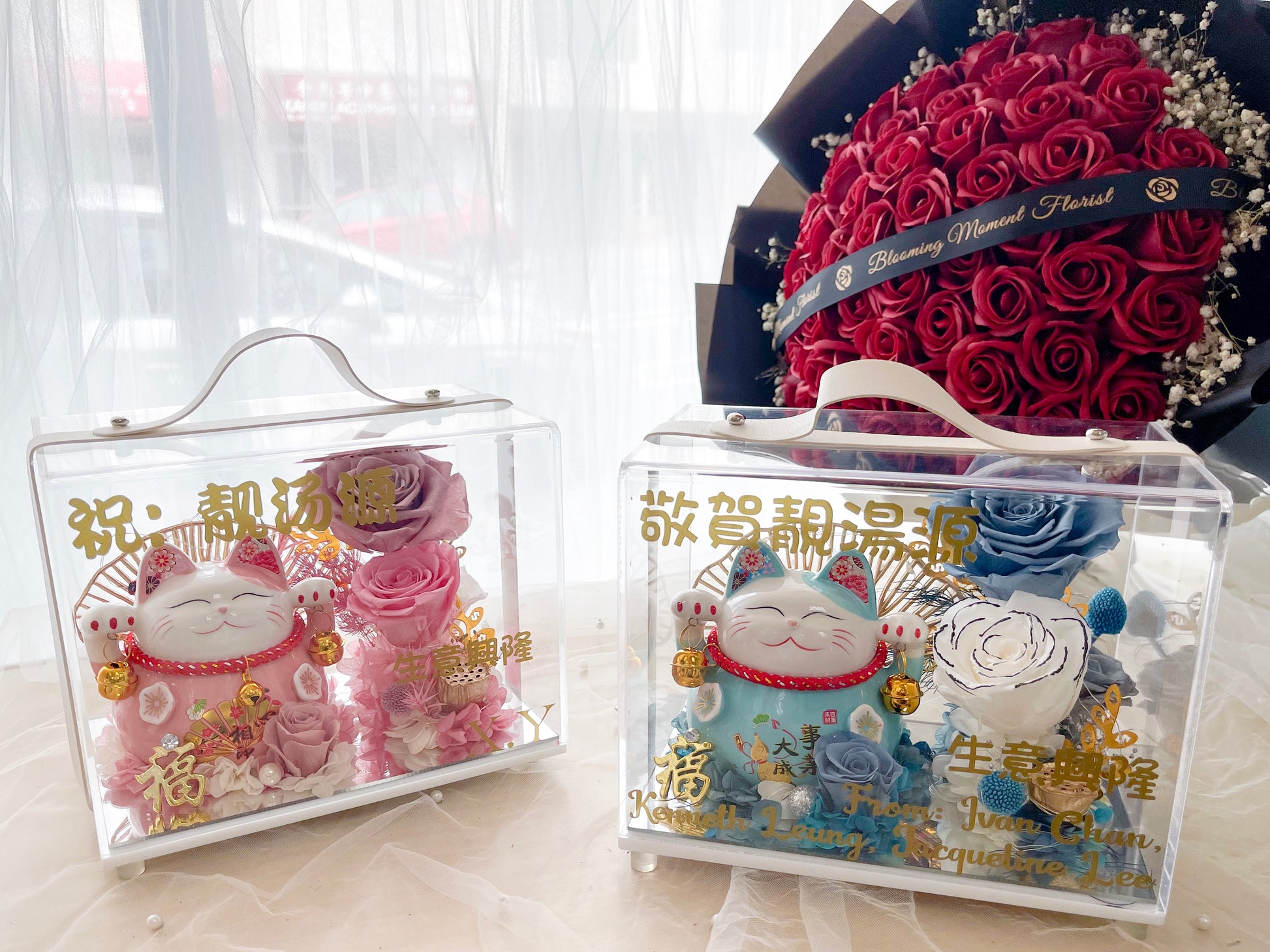 Lucky Cat preserved flower in acrylic box 4 Colors