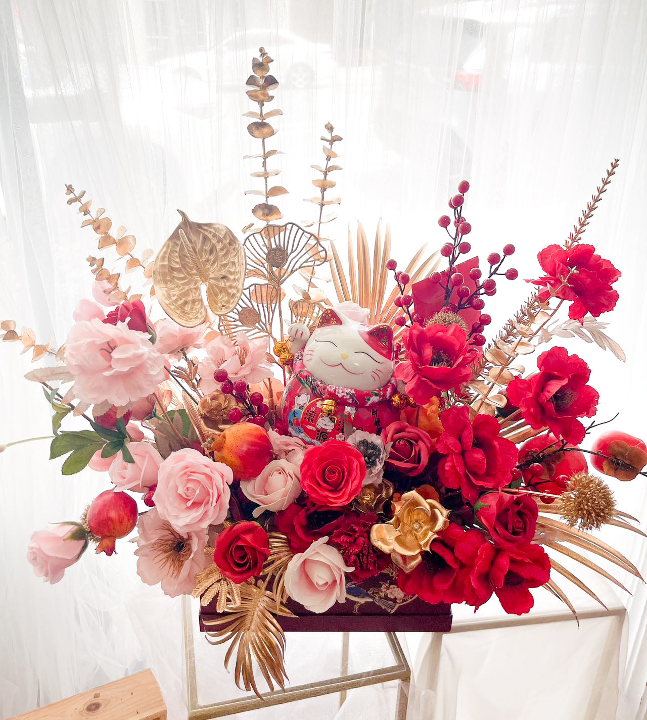 Celebrate Chinese New Year or a grand opening with this lucky cat red and pink flower arrangement. Featuring a combination of soap and artificial flowers, it comes in a beautiful red Chinese style gift box. Perfect for adding a touch of luck and beauty to any setting.