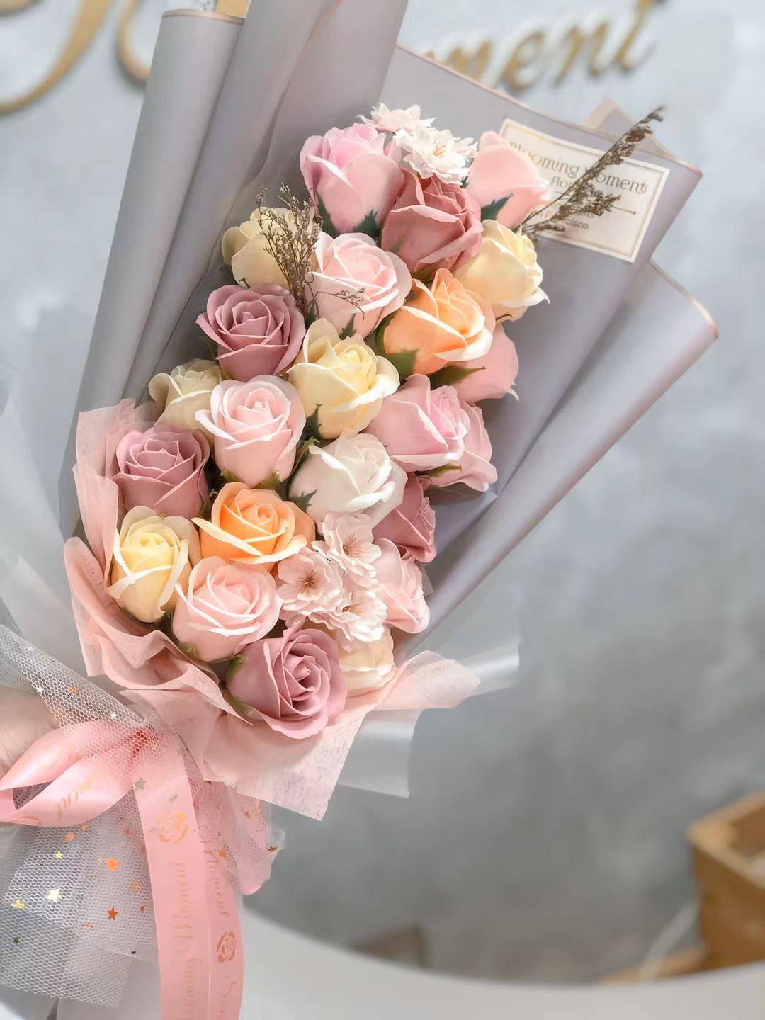 Low contrast and low saturation Color choices of soap flowers in this bouquet