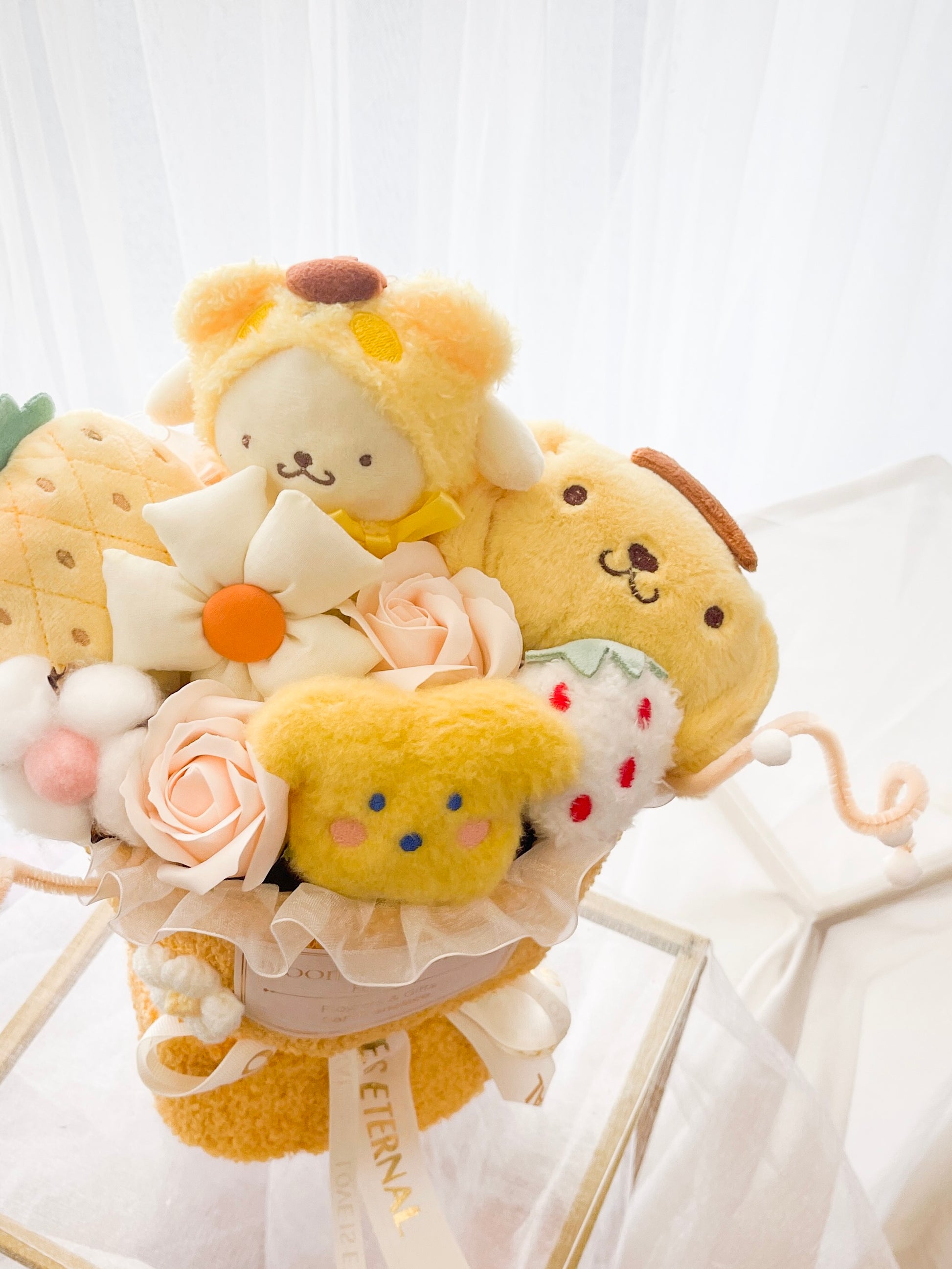 Brighten someone's day with the "Sunny Delight Pom Pom Purin Plush Bouquet"! This delightful arrangement features a collection of plush Pom Pom Purin characters, each one as soft and huggable as the last. The bouquet is designed to resemble a radiant sunburst, with Pom Pom Purin plushies arranged in a vibrant and cheerful display. Perfect for any occasion, this bouquet is sure to bring a smile to anyone's face. Ideal for birthdays, anniversaries, or just to show someone you care, the "Sunny Delight Pom Pom Purin Plush Bouquet" is a unique and heartwarming gift that will be cherished for years to come.
