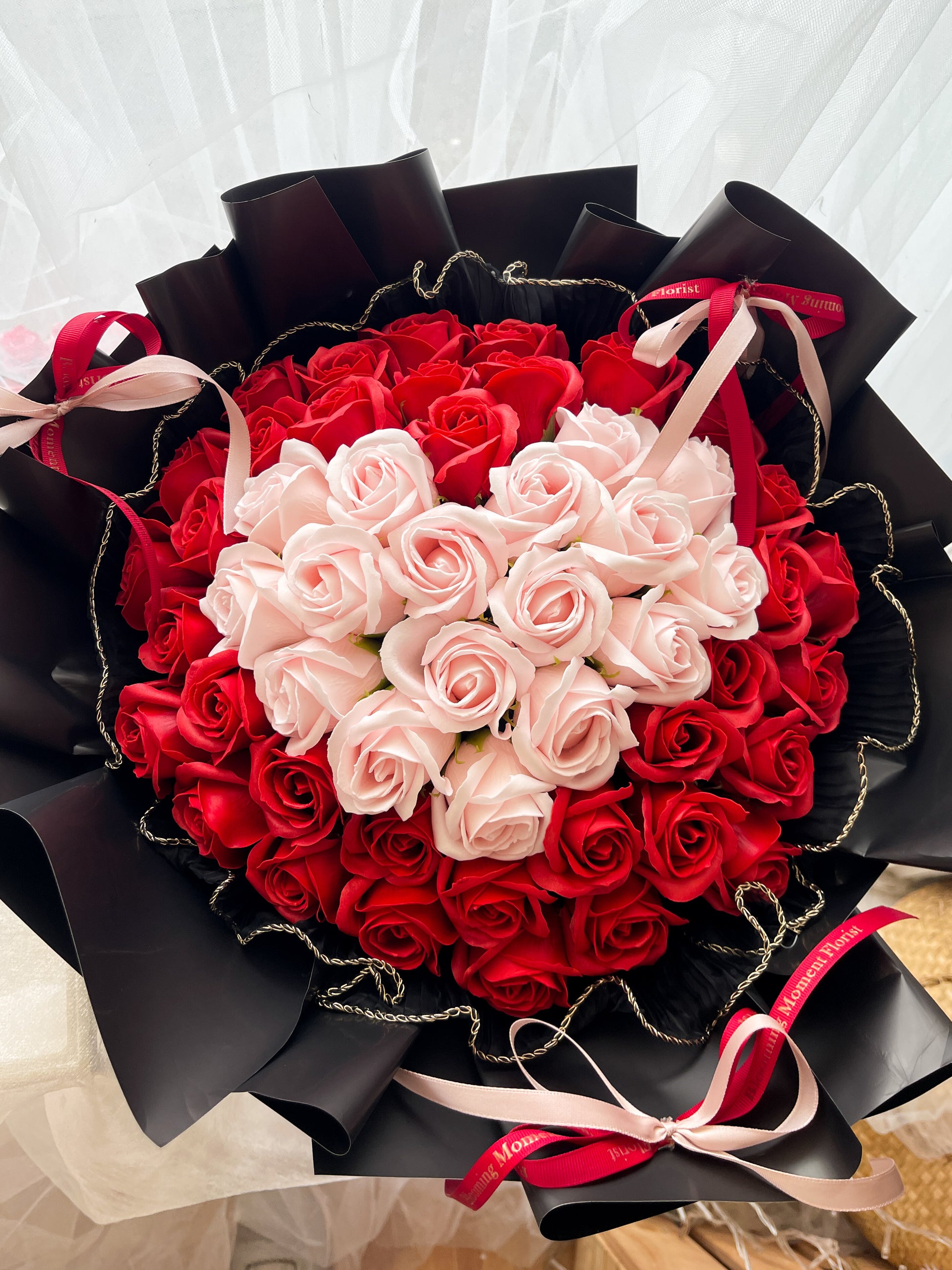 52 Rose Red Affection Blossoms in Pink Heart Soap Flower Bouquet